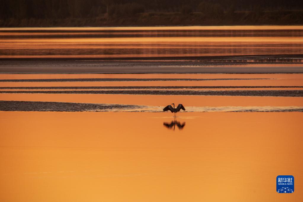 10月10日傍晚,水鳥(niǎo)在黃河下游山東高青段展翅欲飛。
