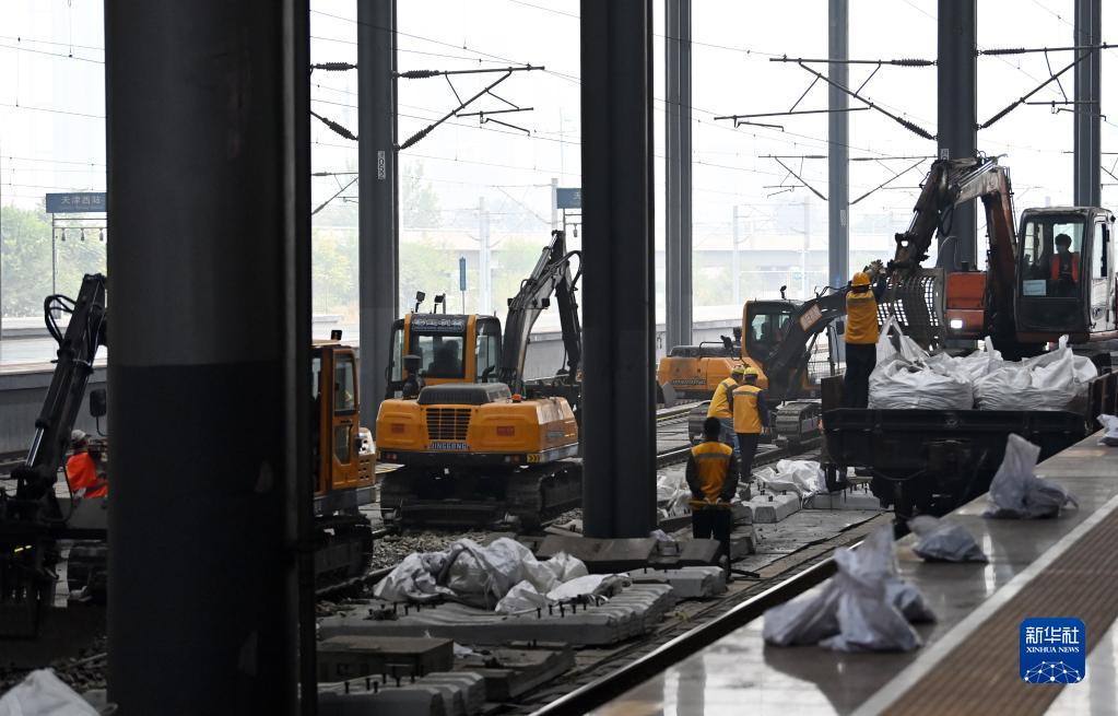 10月14日,施工者在天津西站操作機械設備進(jìn)行換枕作業(yè)。