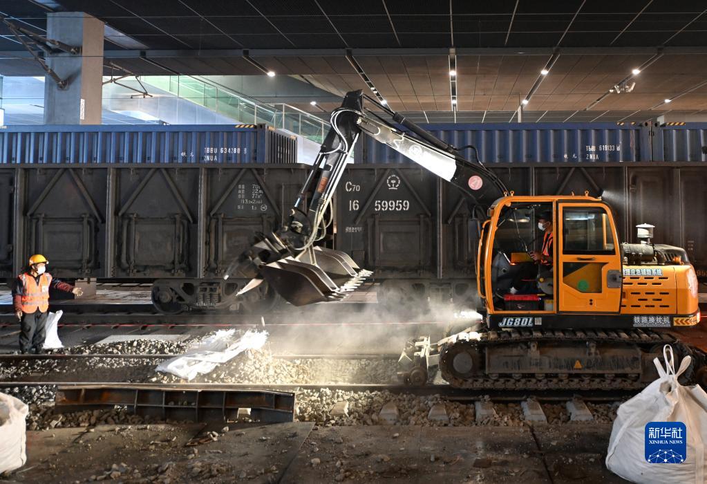 10月14日,施工者在天津西站操作機械設備進(jìn)行換枕作業(yè)。