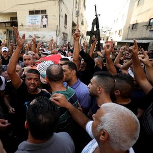 10月14日,在約旦河西岸北部城市杰寧,人們?yōu)楸灰陨熊婈牬蛩赖陌屠账固谷怂驮帷?/p>