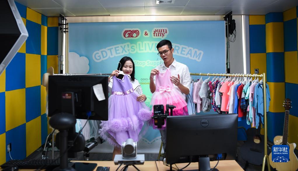 在廣東省紡織品進(jìn)出口股份有限公司,工作人員在進(jìn)行廣交會(huì )線(xiàn)上直播的準備工作(10月14日攝)。