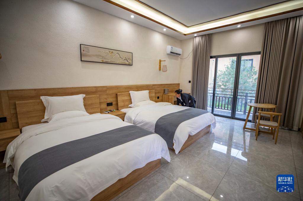 10月14日,在重慶市巫溪縣紅池壩鎮九坪村,一家民宿的工作人員在整理床鋪。