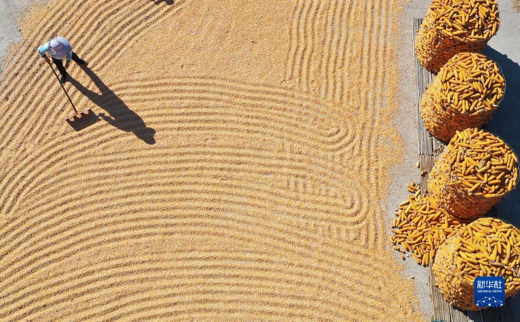10月10日,山東省臨沂市郯城縣郯城街道農民在晾曬收獲的玉米(無(wú)人機照片)。
