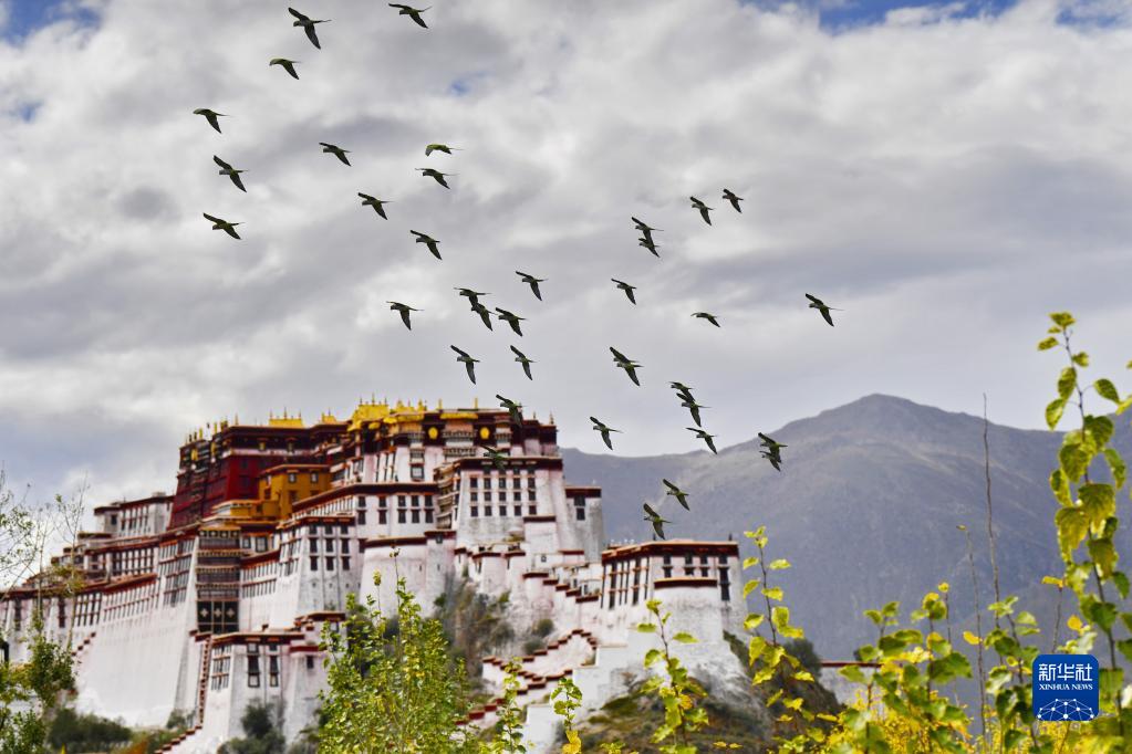 在西藏拉薩市,大紫胸鸚鵡在空中飛翔(10月9日攝)。