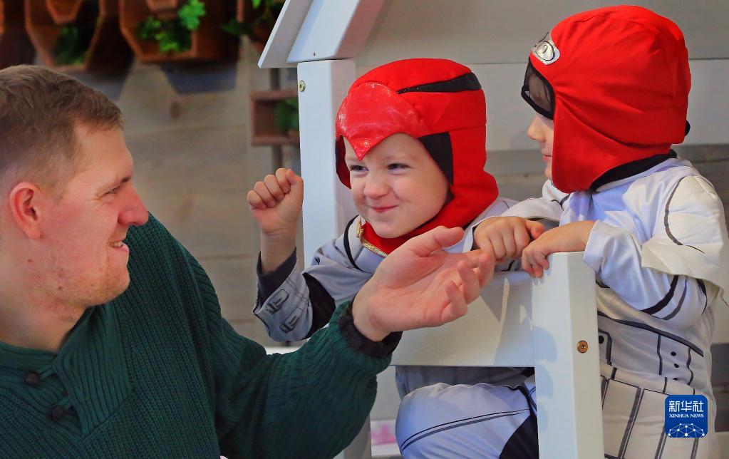 10月15日,在白俄羅斯明斯克,一對雙胞胎和家長(cháng)在活動(dòng)中嬉戲。