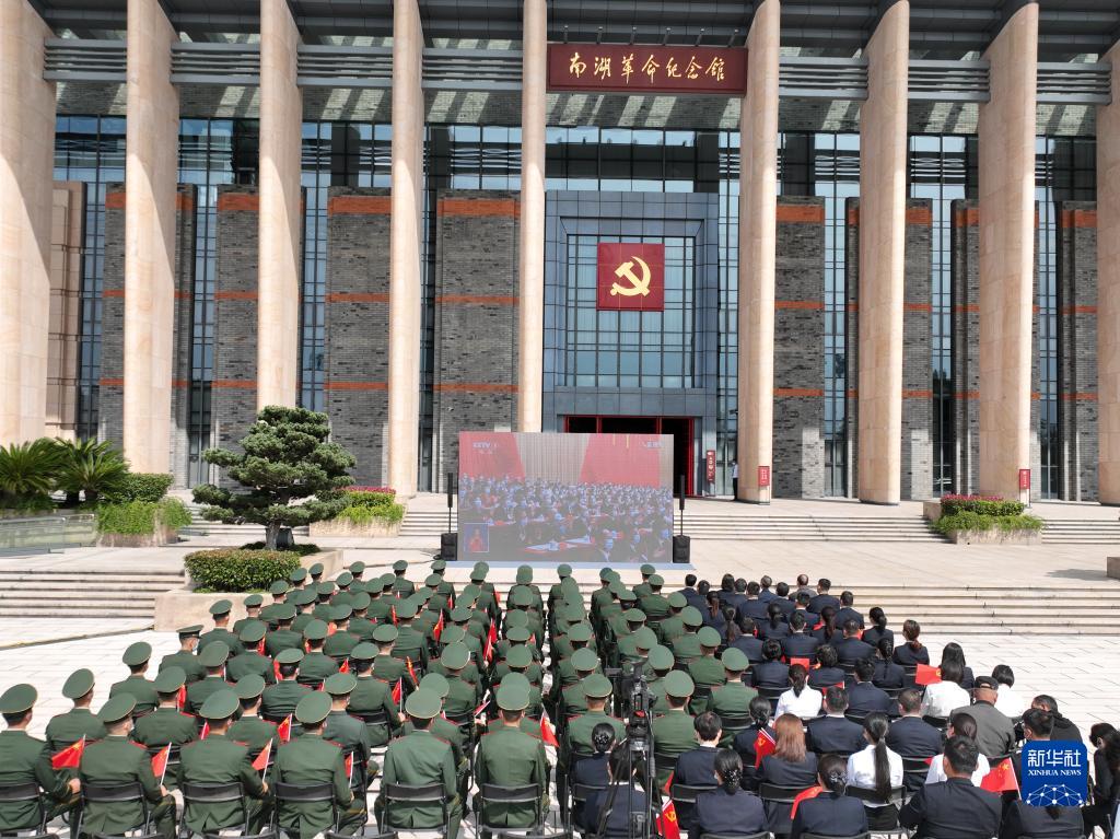 10月16日,武警浙江總隊嘉興支隊官兵在南湖革命紀念館前與工作人員一起收看中國共產(chǎn)黨第二十次全國代表大會(huì )開(kāi)幕會(huì )(無(wú)人機照片)。