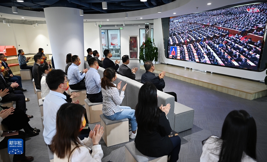 10月16日,在天津市濱海新區濱海-中關(guān)村科技園,企業(yè)員工在收看中國共產(chǎn)黨第二十次全國代表大會(huì )開(kāi)幕會(huì )。