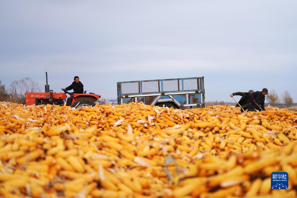 10月15日,在黑龍江省拜泉縣上升鄉上升村,農民在翻曬玉米。