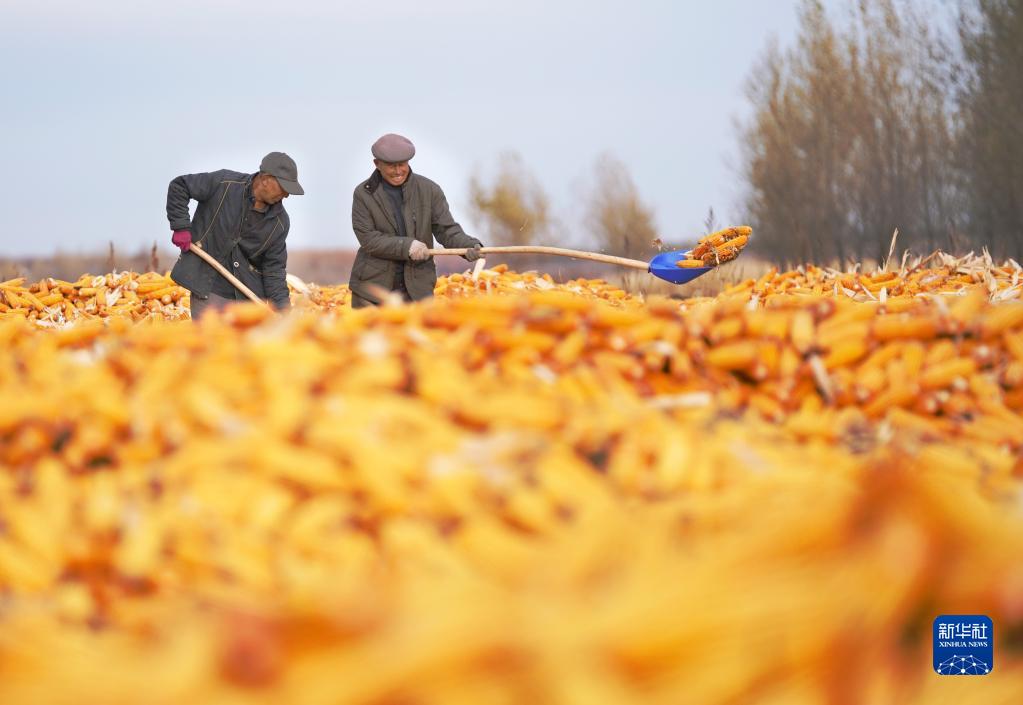 10月15日,在黑龍江省拜泉縣上升鄉上升村,農民在翻曬玉米。