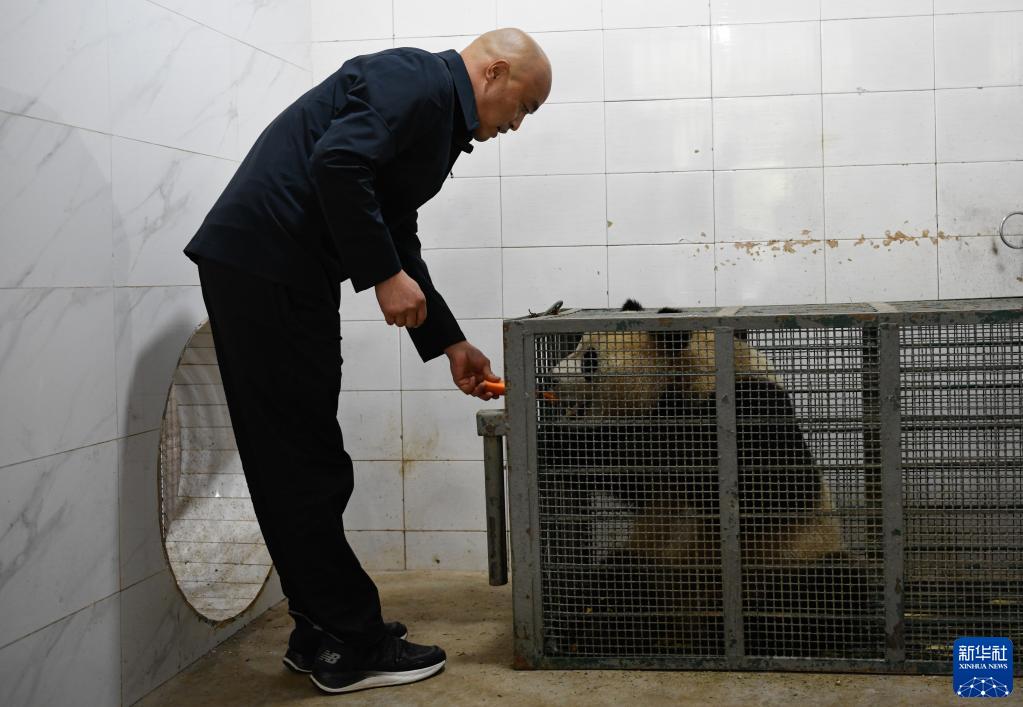 10月18日,在中國大熊貓保護研究中心雅安基地,飼養師董禮用胡蘿卜安撫進(jìn)入轉運籠的大熊貓“四?!?。
