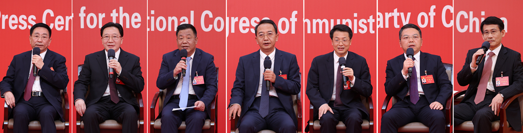 10月19日,中國共產(chǎn)黨第二十次全國代表大會(huì )新聞中心舉行集體采訪(fǎng)。山東、河南、湖北、湖南、廣東、廣西、海南代表團新聞發(fā)言人出席,介紹代表團學(xué)習討論二十大報告情況,并回答記者提問(wèn)(拼版照片)。