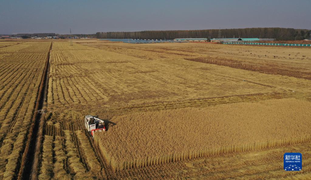 10月19日,在沈陽(yáng)市蘇家屯區紅菱街道北紅村,村民駕駛收割機收割水稻(無(wú)人機照片)。