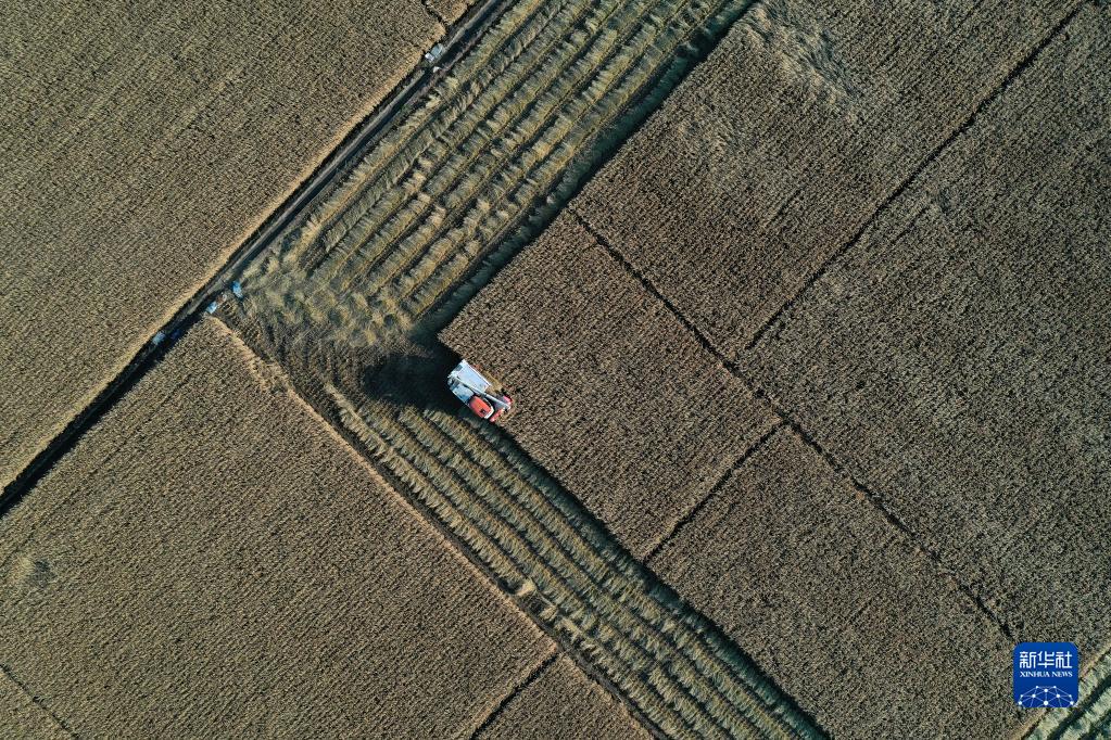 10月19日,在沈陽(yáng)市蘇家屯區紅菱街道北紅村,村民駕駛收割機收割水稻(無(wú)人機照片)。