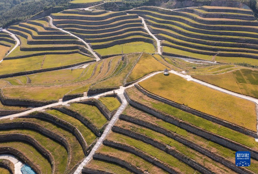 10月19日拍攝的杭州市富陽(yáng)區永昌鎮藍田灣的梯田水稻。這片梯田是由荒山改造建成的“海綿農田”,雨季降水可以蓄積到農田下的地下隱形水庫供調劑使用(無(wú)人機照片)。