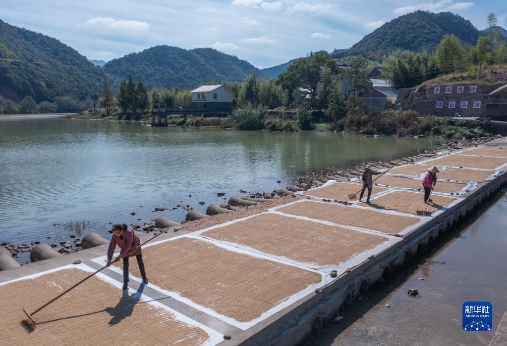 10月20日,杭州市富陽(yáng)區湖源鄉石龍村的農民在壺源溪畔晾曬收獲的稻谷(無(wú)人機照片)。