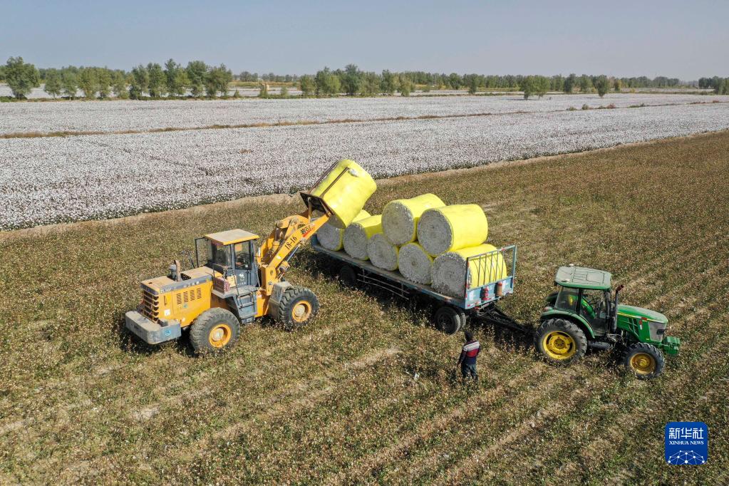 在新疆巴音郭楞蒙古自治州尉犁縣興平鎮巴西阿瓦提村的一塊棉田里,車(chē)輛在裝運棉包(10月14日攝,無(wú)人機照片)