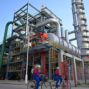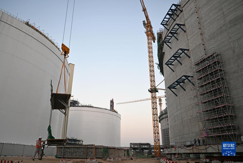 10月19日,在中石化天津液化天然氣(LNG)接收站,工作人員在吊裝儲罐部件。