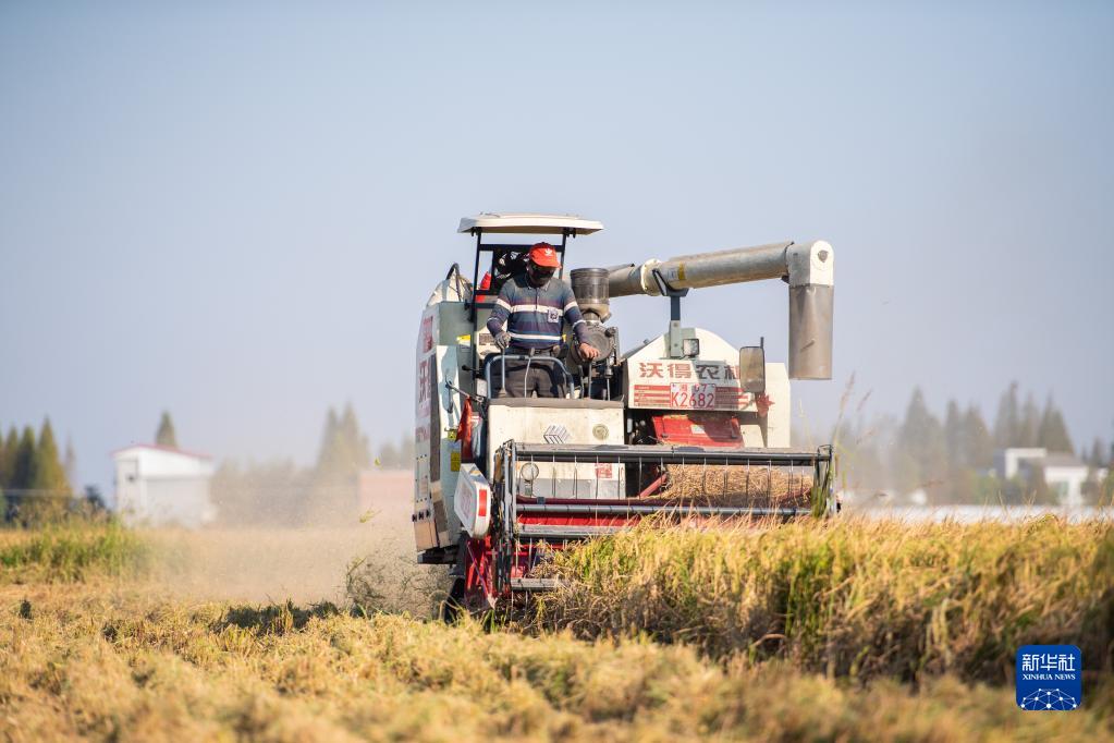 10月19日,在湖南省常德市安鄉縣三岔河鎮,農民駕駛農機收割晚稻。