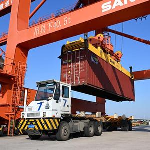 10月19日,在合肥港國際集裝箱碼頭,貨車(chē)在裝載集裝箱。