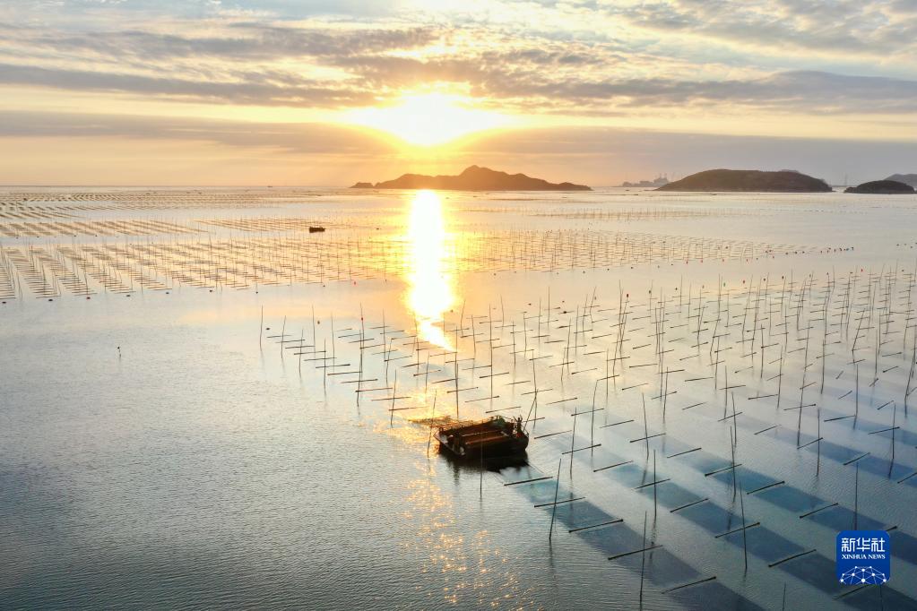 10月21日,福建省霞浦縣松山街道沙塘街村漁民在朝陽(yáng)照耀的大海上收割頭水紫菜(無(wú)人機照片)。