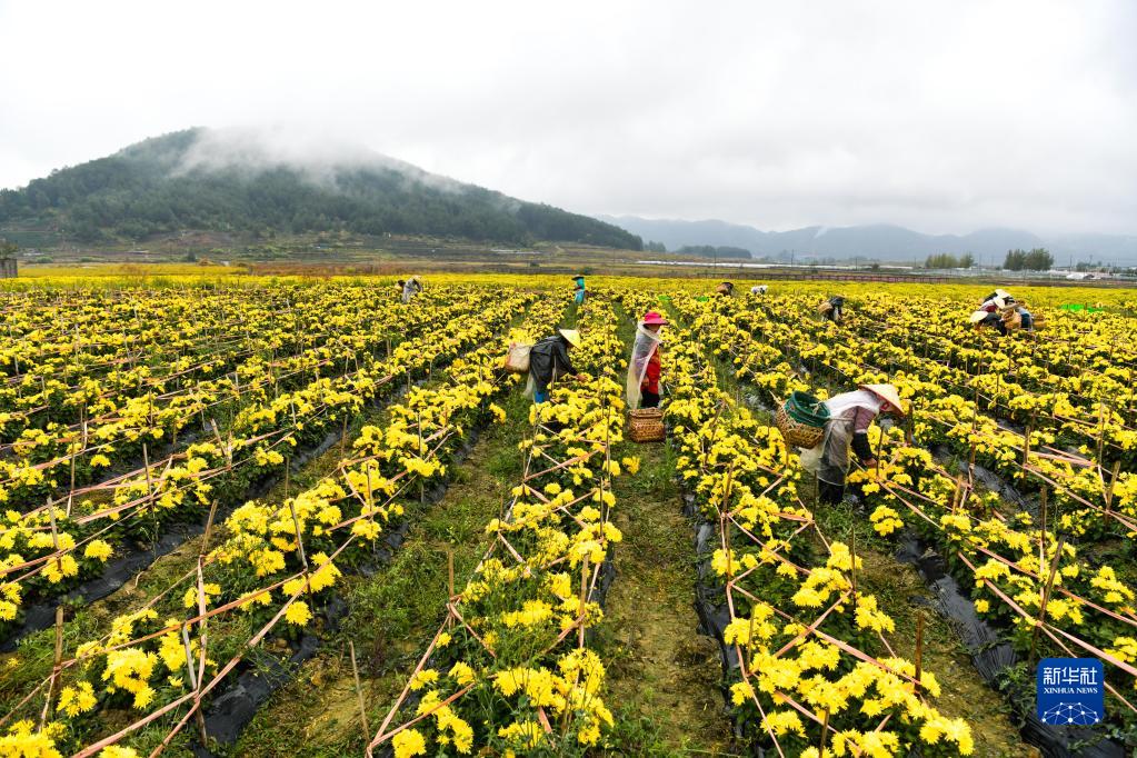 金秋時(shí)節,貴州省黔南布依族苗族自治州貴定縣云霧鎮種植的1000余畝菊花陸續進(jìn)入采摘期,當地村民忙著(zhù)采摘、分揀、烘干菊花,供應市場(chǎng)。