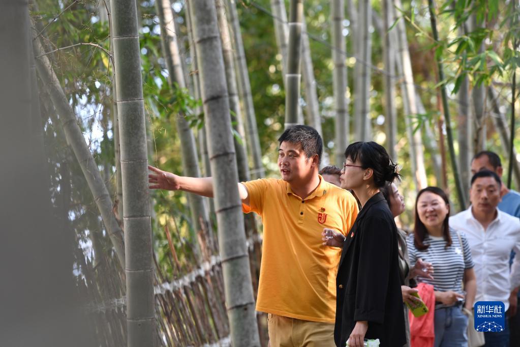 10月23日,在占西坑村竹酒生產(chǎn)基地,陳清(左一)向前來(lái)“取經(jīng)”的創(chuàng )業(yè)青年介紹竹酒生產(chǎn)技術(shù)。