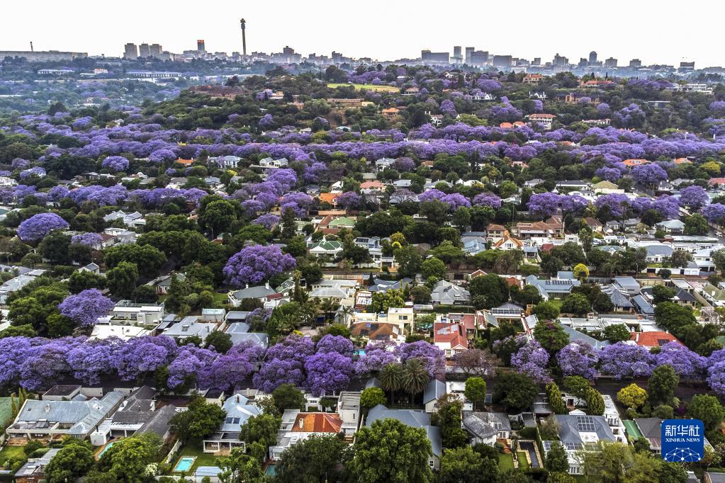 這是10月24日在南非約翰內斯堡拍攝的盛開(kāi)的藍花楹(無(wú)人機照片)。