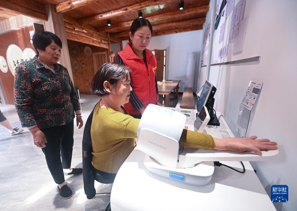 10月25日,在昌化鎮后營(yíng)村鄰里中心的老人康養館,黨員志愿者為老人測量血壓。