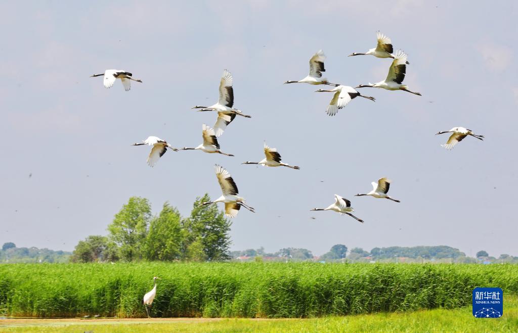 丹頂鶴在黑龍江扎龍國家級自然保護區自由翱翔(2022年6月15日攝)。 新華社發(fā)(宋燕軍 攝)