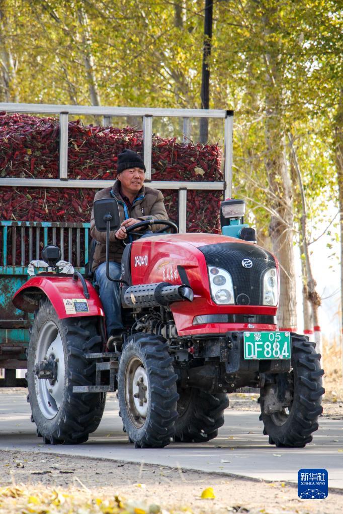 10月25日,在開(kāi)魯縣東風(fēng)鎮東方紅村,村民駕駛拖拉機運輸紅干椒。