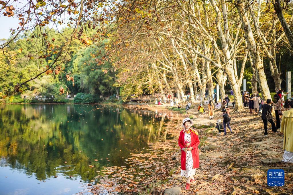 10月25日,市民在貴陽(yáng)市花溪國家城市濕地公園黃金大道拍照留念。
