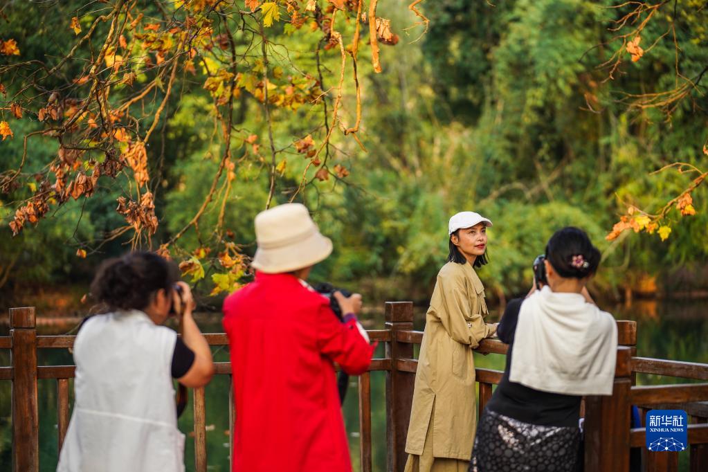 10月25日,市民在貴陽(yáng)市花溪國家城市濕地公園黃金大道拍照留念。
