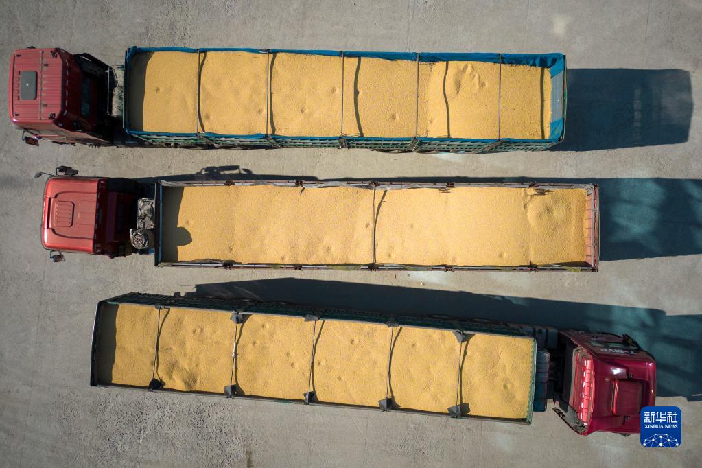 這是10月25日拍攝的裝滿(mǎn)大豆的運糧車(chē)在綏化市益盛糧食購銷(xiāo)有限公司院內等待入庫(無(wú)人機照片)。