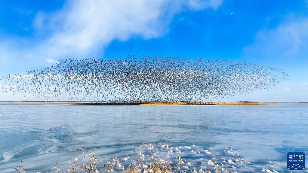 這是2021年12月25日在山東黃河三角洲國家級自然保護區拍攝的鳥(niǎo)群(無(wú)人機照片)。