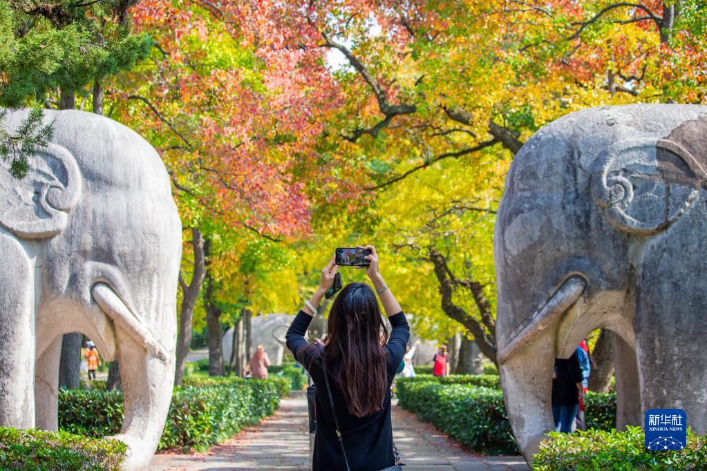 10月23日,游人在江蘇省南京明孝陵景區石象路賞景拍照。
