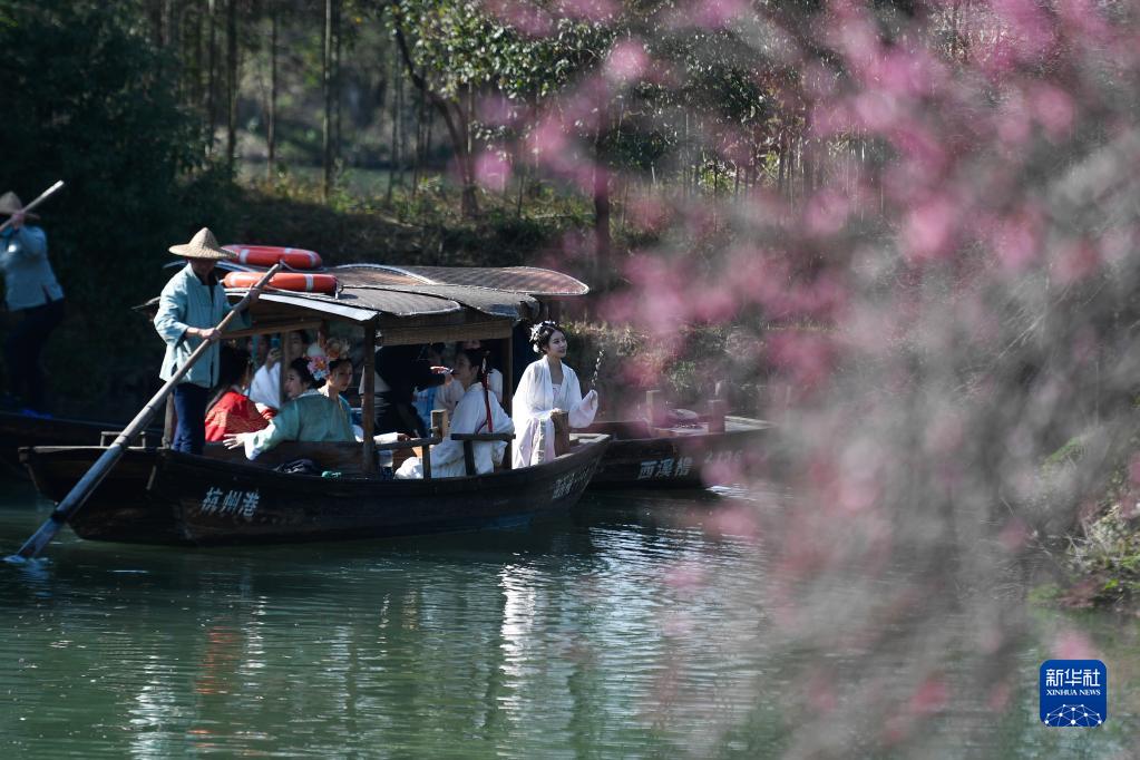 漢服愛(ài)好者在杭州西溪國家濕地公園乘坐搖櫓船賞梅(2021年2月21日攝)。