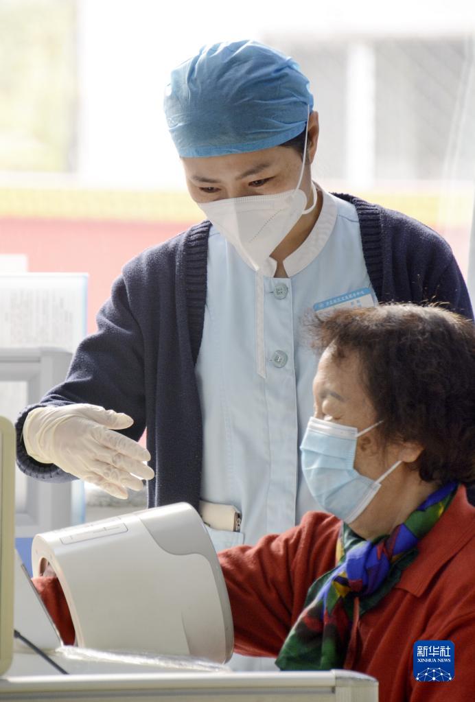 北京市豐臺區方莊社區衛生服務(wù)中心的醫護人員在協(xié)助一名老人測量血壓(10月26日攝)。