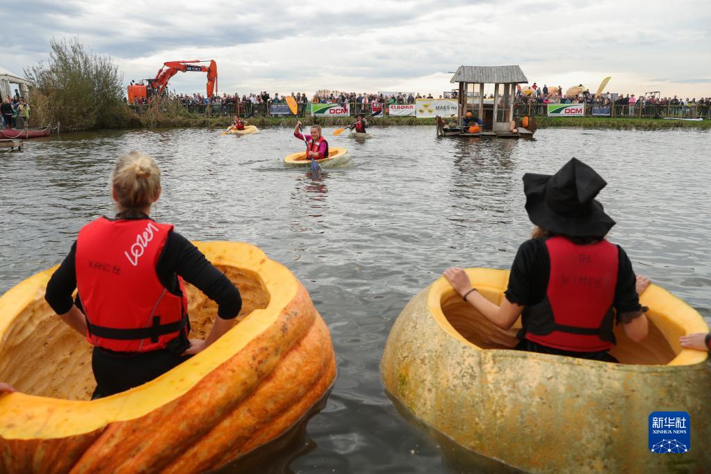 10月23日,人們在比利時(shí)卡斯特萊市利赫塔爾特村參加劃南瓜船比賽。