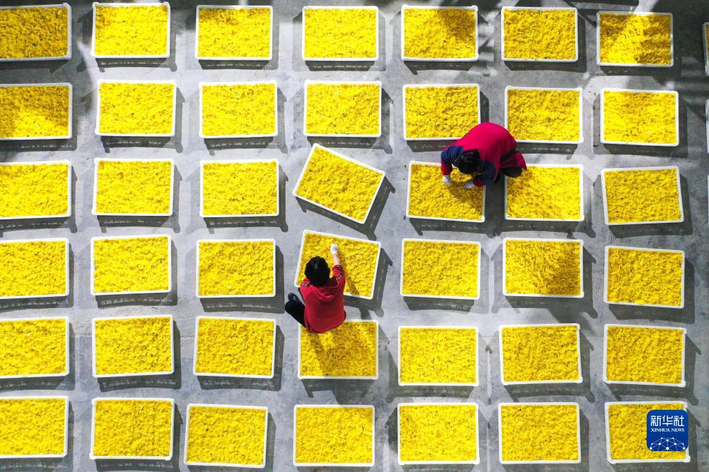10月20日,村民在貴州省貴定縣云霧鎮一家菊花加工車(chē)間攤晾金絲皇菊(無(wú)人機照片)。