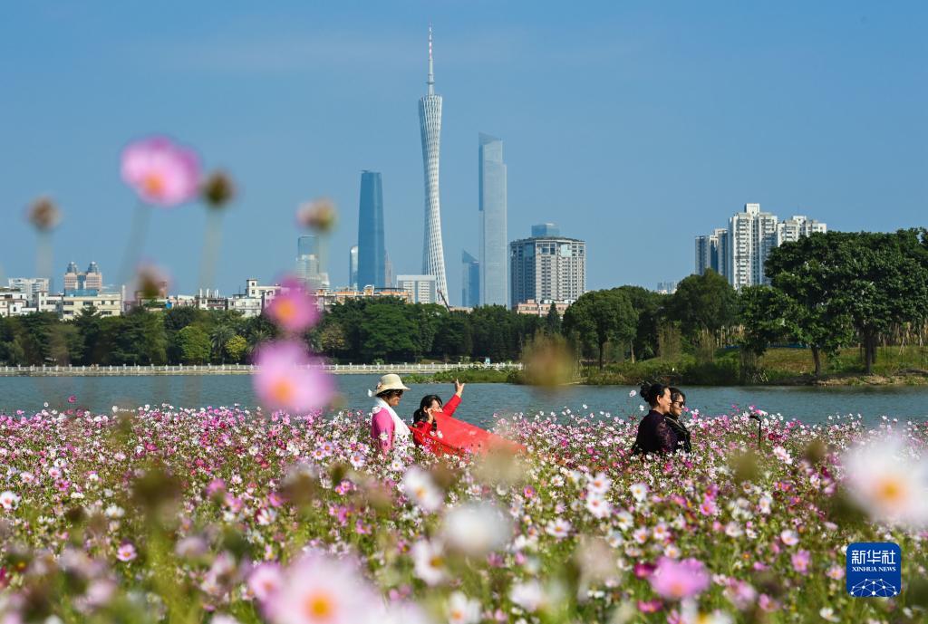 游客徜徉在廣州海珠濕地海珠湖畔波斯菊花海之中(2020年11月3日攝)。