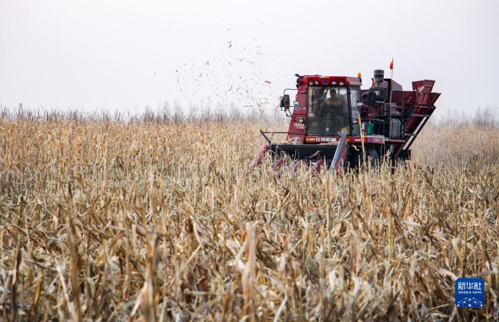 10月29日,在內蒙古通遼市科爾沁左翼中旗花吐古拉鎮三家子村的鹽堿化耕地改良試點(diǎn)示范區,農機手駕駛收割機收割玉米。