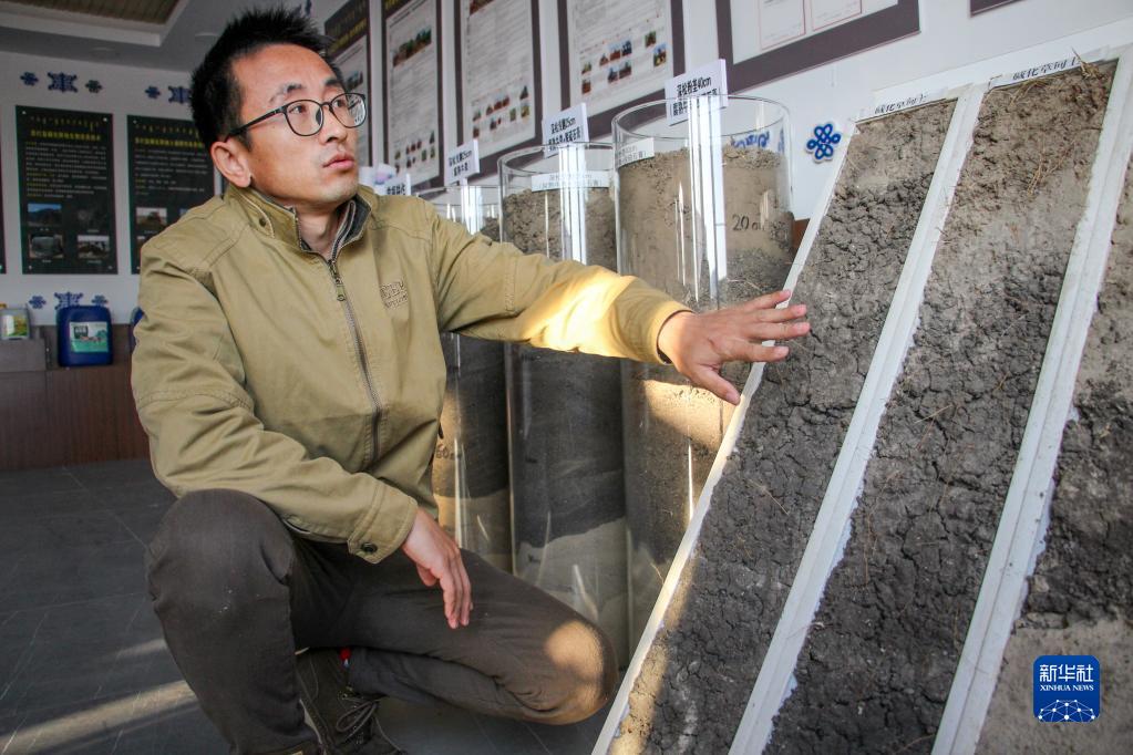 10月29日,在內蒙古通遼市科爾沁左翼中旗花吐古拉鎮三家子村的鹽堿地改良項目示范基地內,工作人員王偉介紹鹽堿地分類(lèi)。