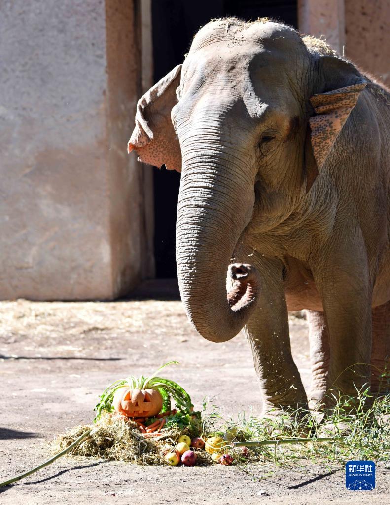 10月30日,在意大利羅馬動(dòng)物園,大象準備享用節日南瓜。