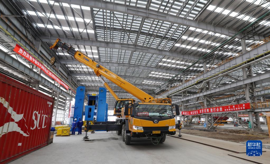 中船長(cháng)興造船基地二期工程船體聯(lián)合車(chē)間內首臺大型設備主體結構吊裝現場(chǎng)(10月31日攝)。