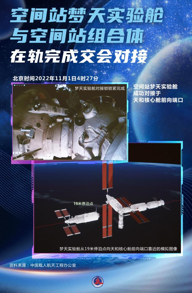 據中國載人航天工程辦公室消息,空間站夢(mèng)天實(shí)驗艙發(fā)射入軌后,于北京時(shí)間2022年11月1日4時(shí)27分,成功對接于天和核心艙前向端口,整個(gè)交會(huì )對接過(guò)程歷時(shí)約13小時(shí)。