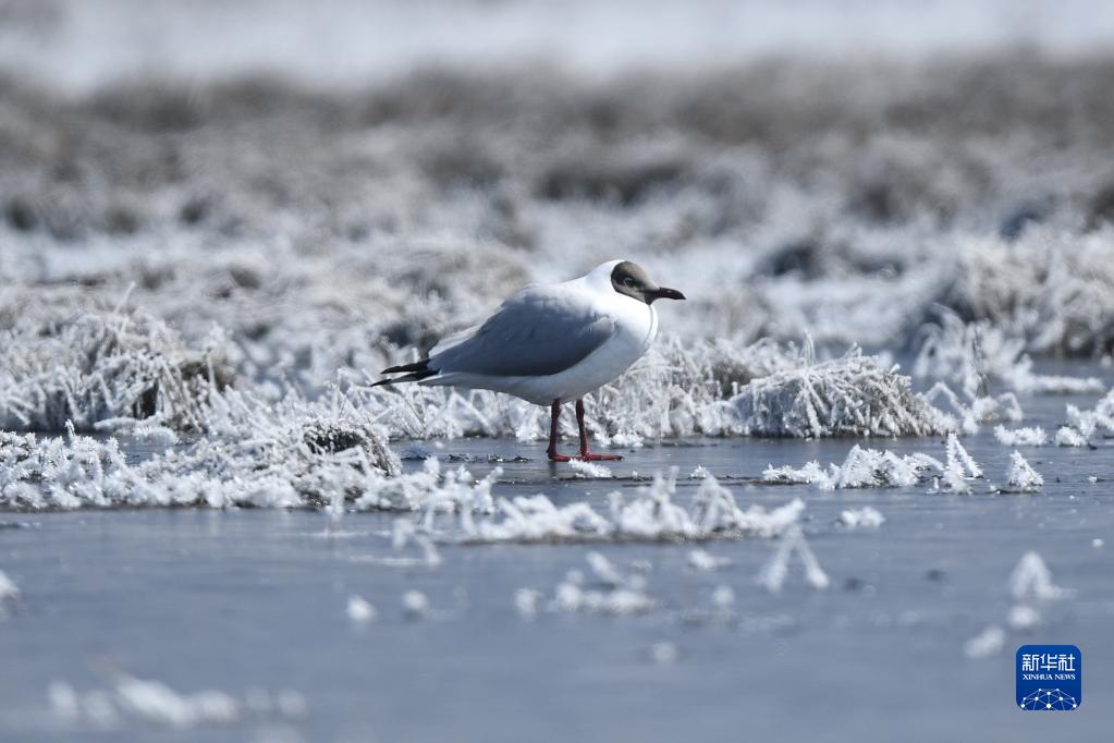 這是2020年4月8日在青海省海北藏族自治州剛察縣青海湖畔拍攝的棕頭鷗。