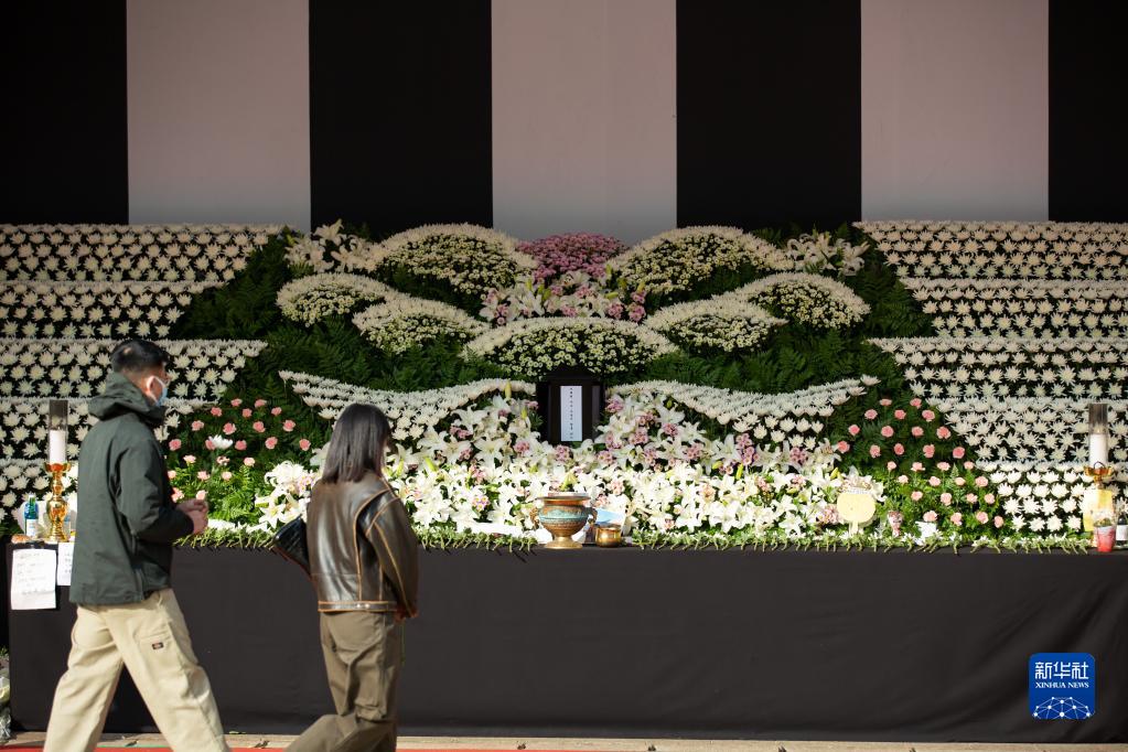 11月1日,民眾走進(jìn)設在韓國首爾廣場(chǎng)首爾圖書(shū)館正門(mén)前的集體焚香所,為遇難者獻花默哀。