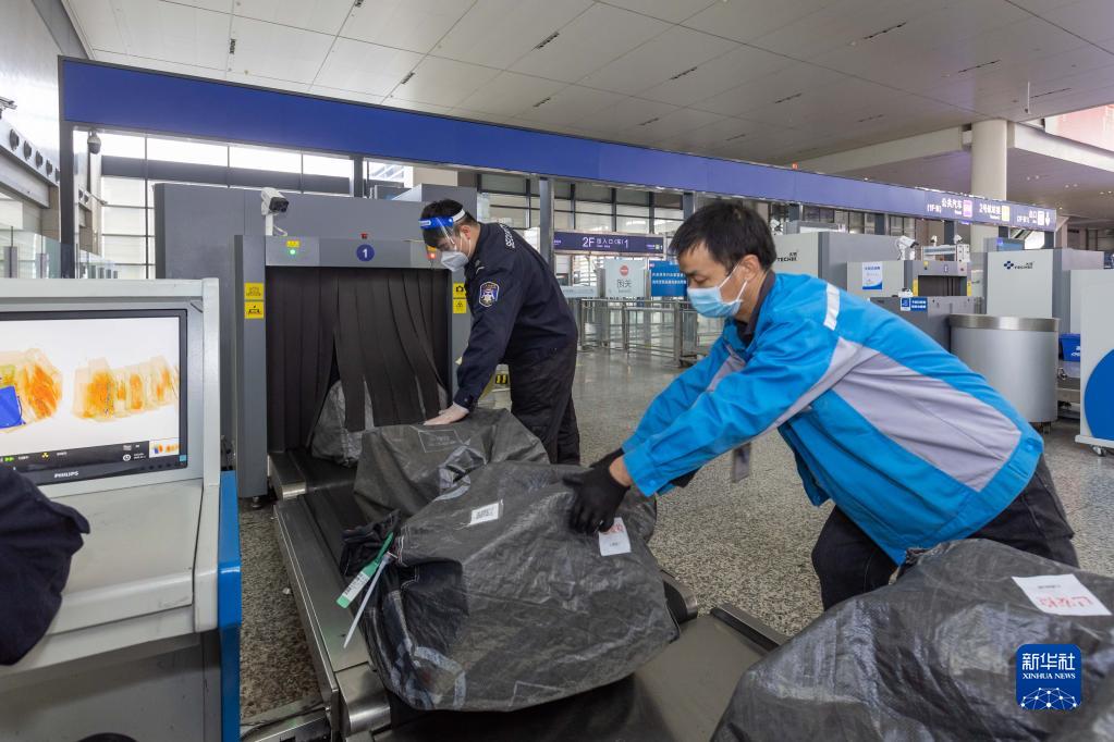 11月1日,在上海虹橋站內貨物專(zhuān)用安檢口,鐵路工作人員搬運通過(guò)安檢的貨物。