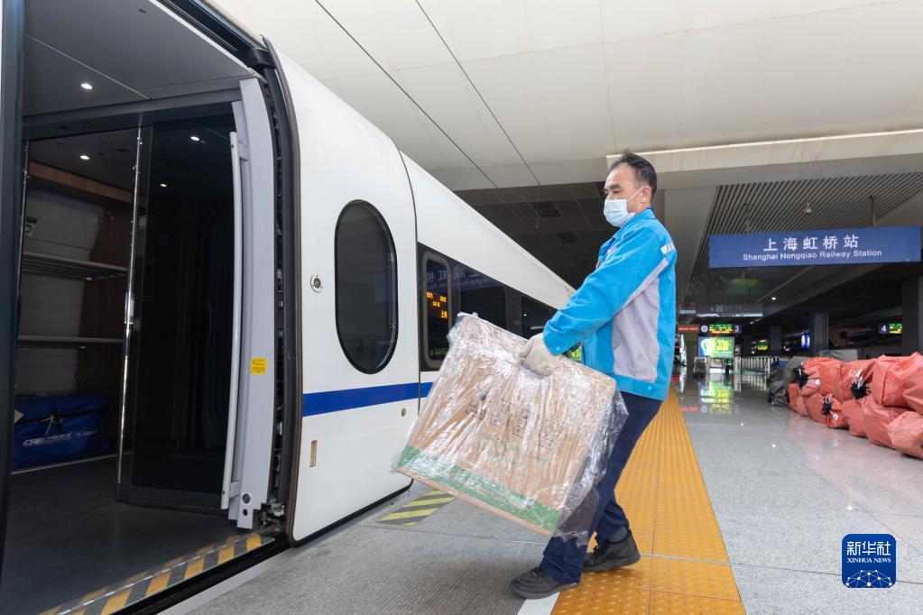 11月1日,在上海虹橋站,鐵路工作人員將貨物搬到G1373次列車(chē)上。