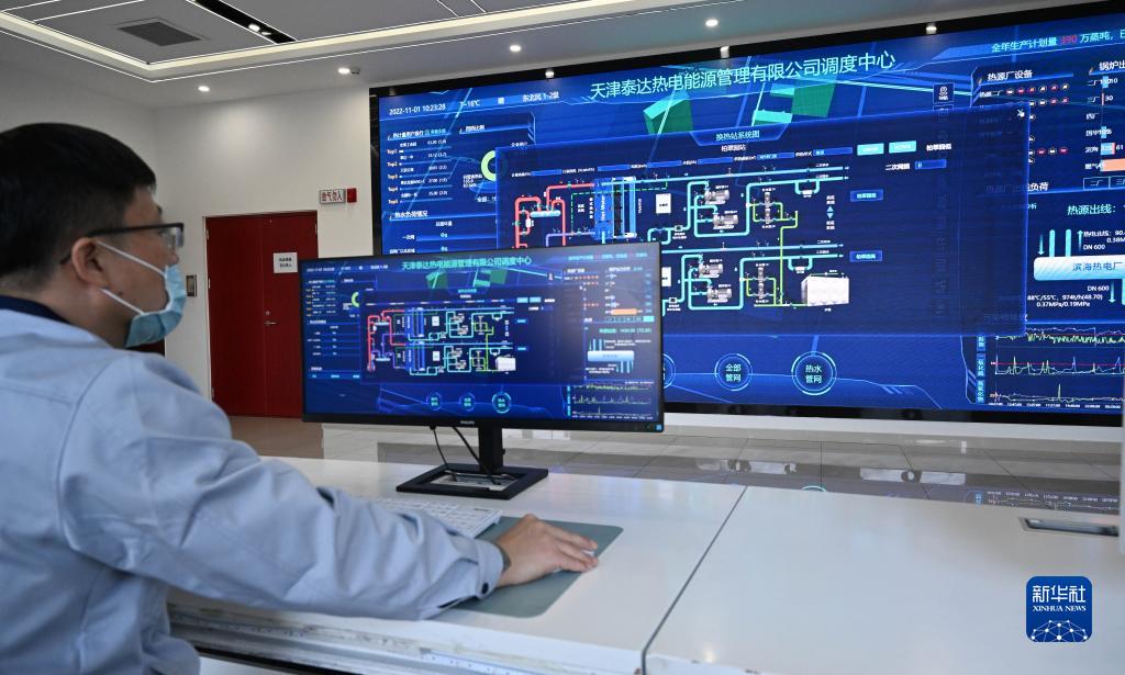 11月1日,工作人員在天津泰達熱電能源管理有限公司調度指揮室監測供熱運行情況。
